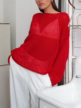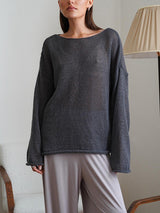 長袖ルーズシースルーソリッドカラースプリットジョイントラウンドネックセータートップス