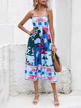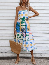 ハイウエストのノースリーブプリーツプリーツプリントプリントスプリットジョイントカラーレスミディドレススリップドレス