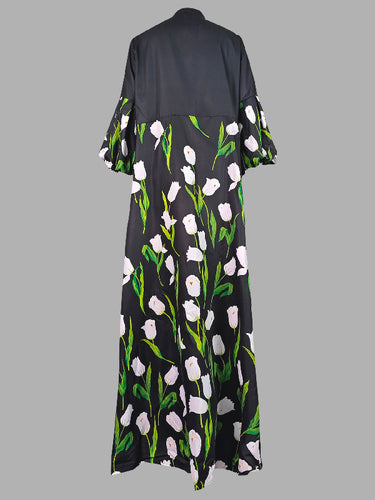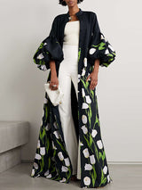 長袖ルーズルーズフローラルプリントプリーツスプリットジョイントスタンドカラートレンチコート