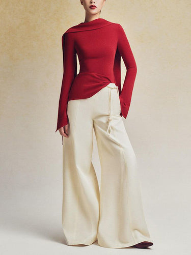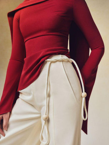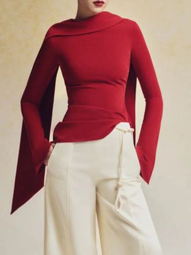 フレアスリーブ長袖ソリッドカラージッパーボートネックTシャツトップス