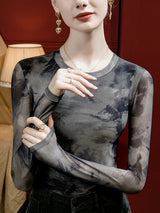 長袖プラスサイズのスプリットジョイントタイダイラウンドネックTシャツのトップス