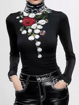 長袖スキニーフラワープリントスプリットジョイントハイネックTシャツトップス