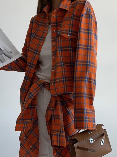 長袖のゆるいボタン付きの格子縞のポケットラペルブラウスシャツのトップス