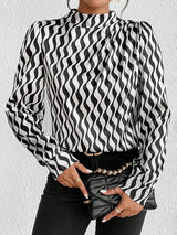 長袖ルーズコントラスト色プリーツプリーツプリントプリントスプリットジョイントモックネックブラウスシャツのトップス