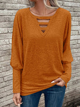 長袖ゆるい中空のソリッドカラースプリットジョイントVネックTシャツのトップス