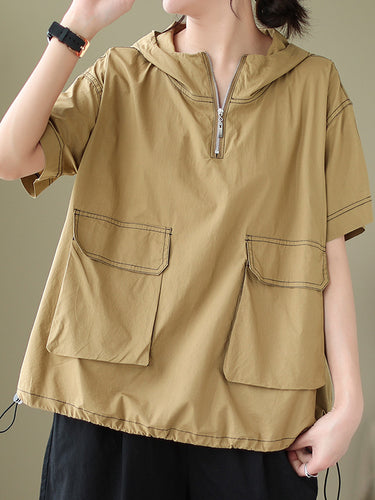 ゆるい半袖ジッパーフード付きTシャツのトップス