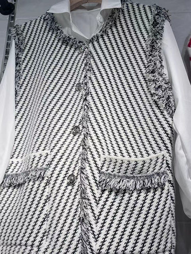 ゆるいノースリーブボタン付きフリンジポケットストライプVネックベストアウターウェア