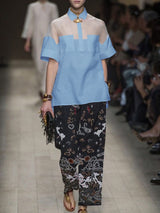 半袖シースルーソリッドカラースプリットジョイントラペルブラウスシャツのトップス