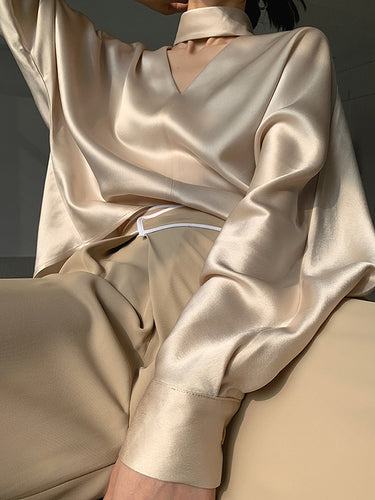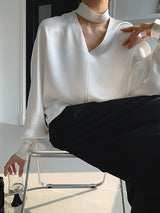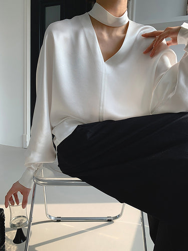 長袖ルーズホロウの光沢のあるソリッドカラーVネックブラウスとシャツのトップス