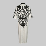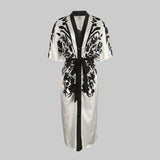 ハーフスリーブフラワープリント縛られたウエストVネックミディドレス