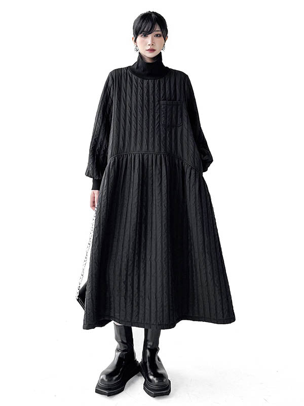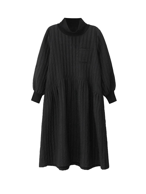 A-Line Long Sleeves Embossed Pockets Quilted Solid Color Split-Joint High Neck Midi Dresses Sweater Dresses