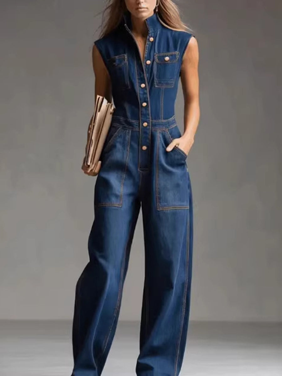 Loose Plus Size Buttoned Pockets Solid Color Split-Joint Stand Collar Jumpsuits