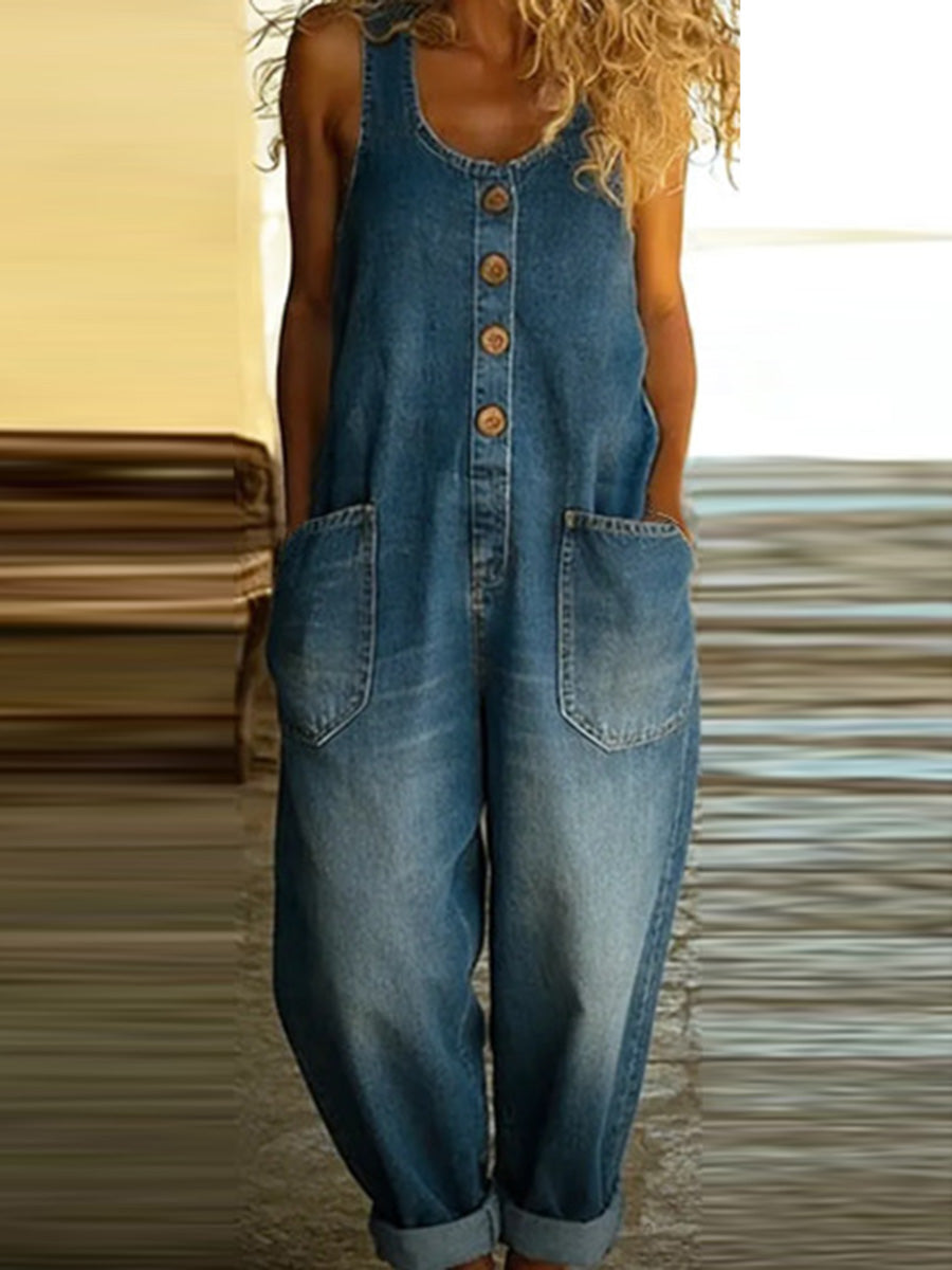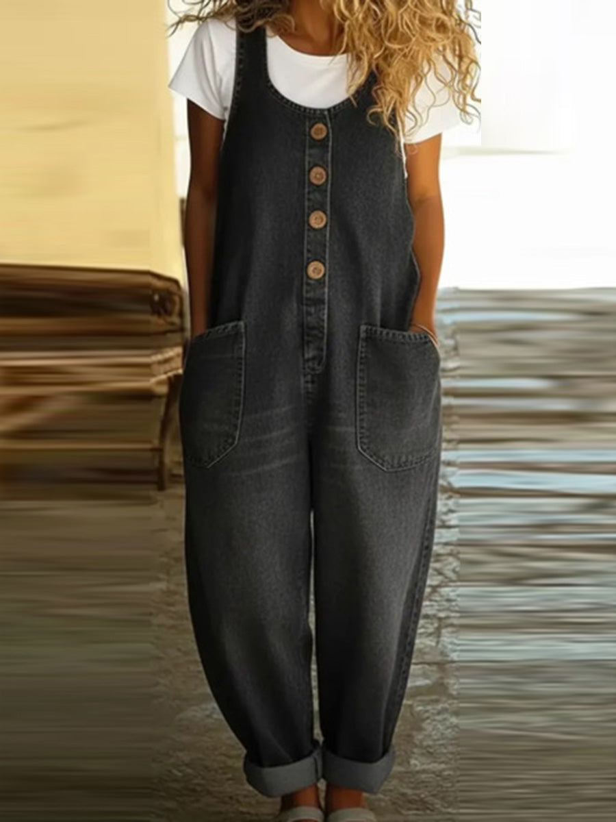 Loose Plus Size Buttoned Pockets Solid Color Split-Joint U-Neck Overalls