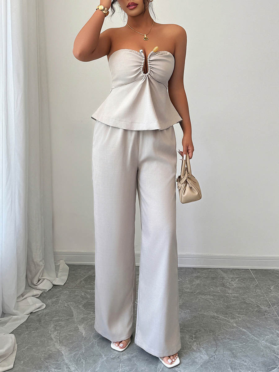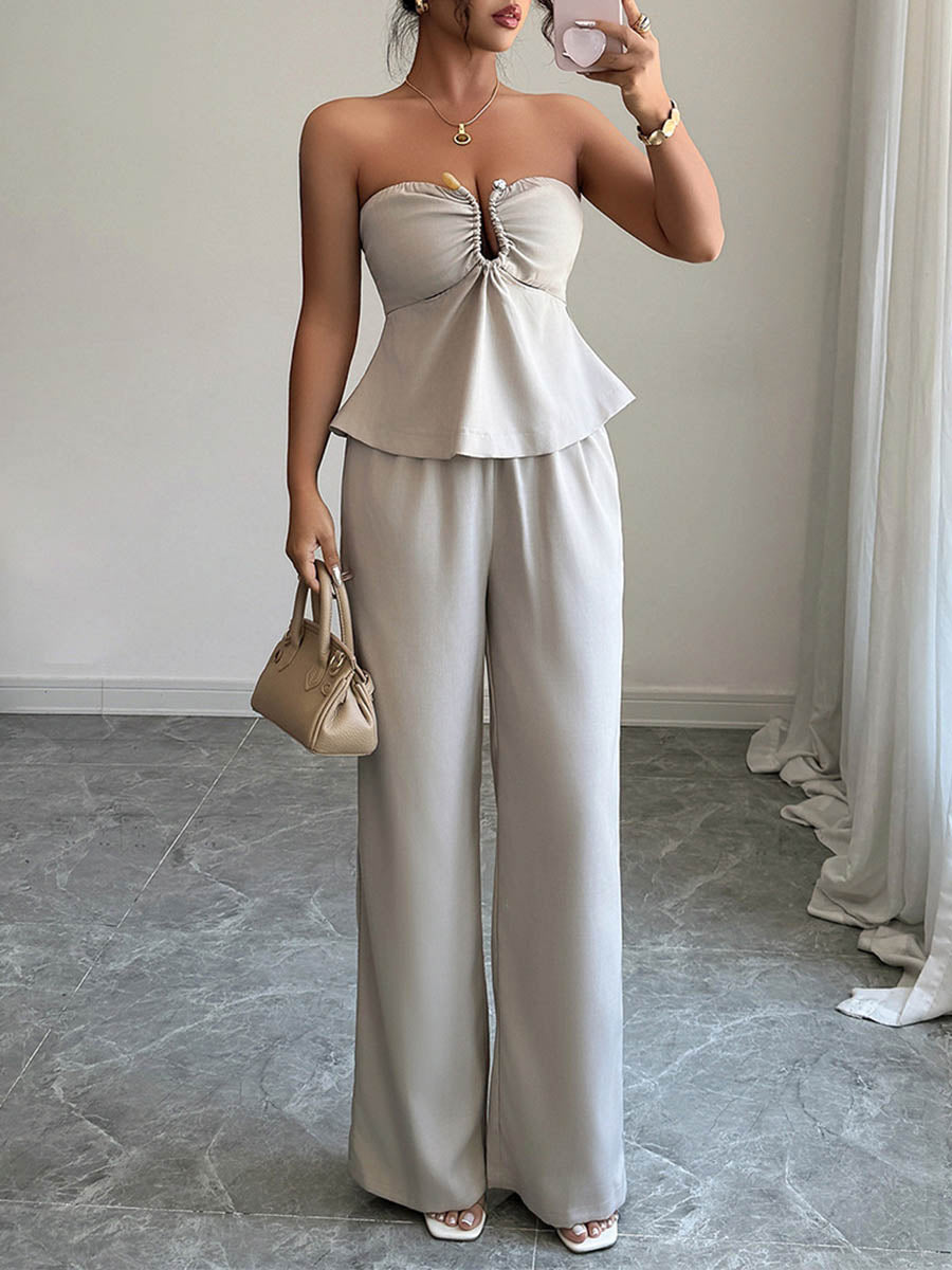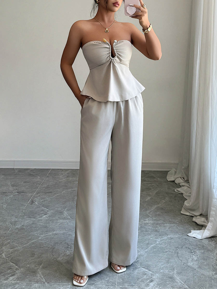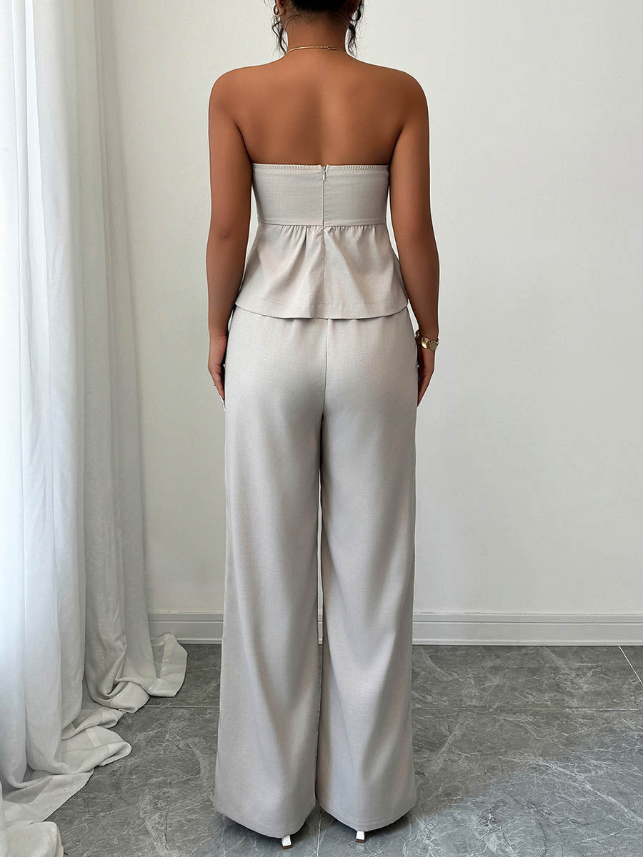 Solid Color Pleated Buttoned Ruffled Tube Blouses&Shirts Tops + High Waisted Zipper Column Pants Trousers Two Pieces Set