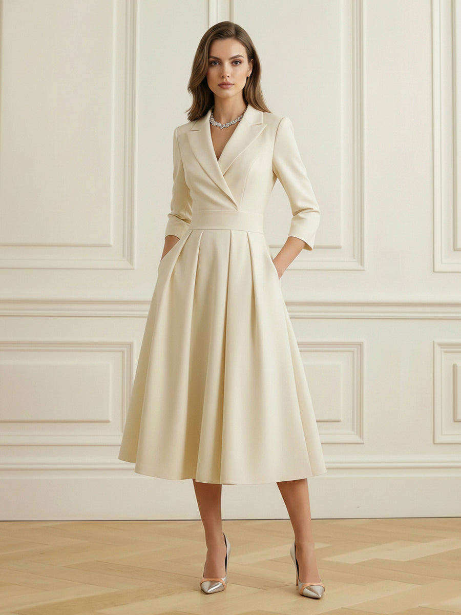 A-Line Elasticated Waist Big Hemline Pleated Solid Color Split-Joint Notched Collar Blazer Midi Dresses
