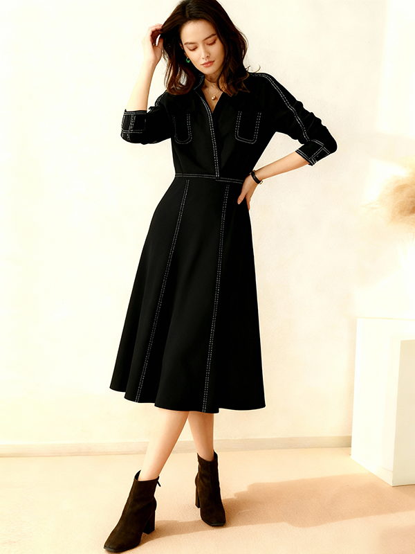 A-Line Elasticated Waist Contrast Color Line Split-Joint Lapel Midi Dresses