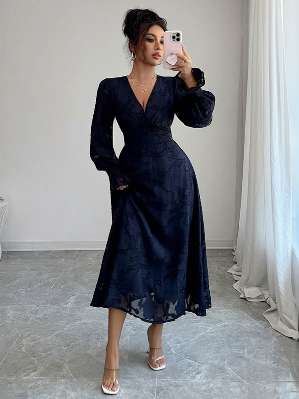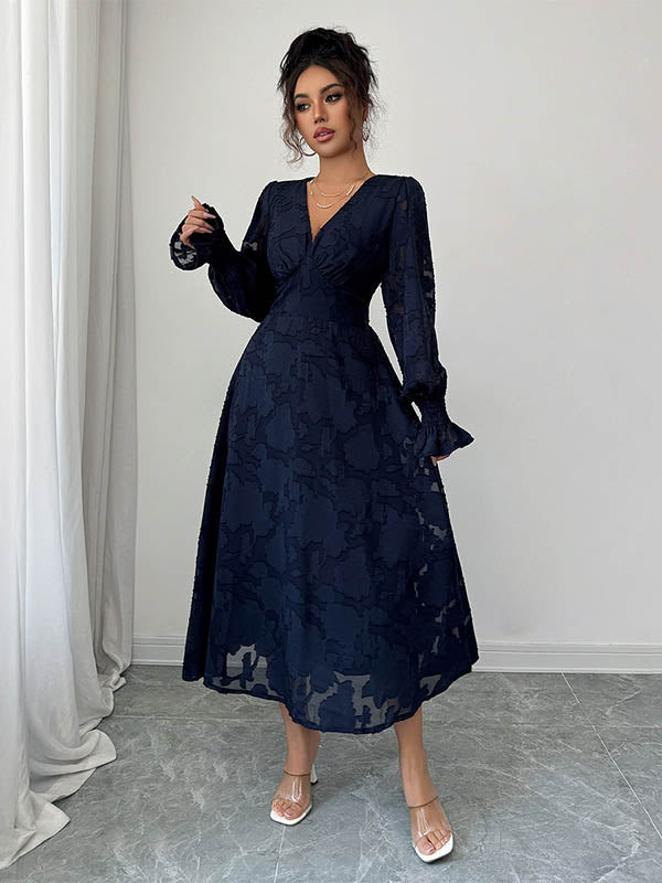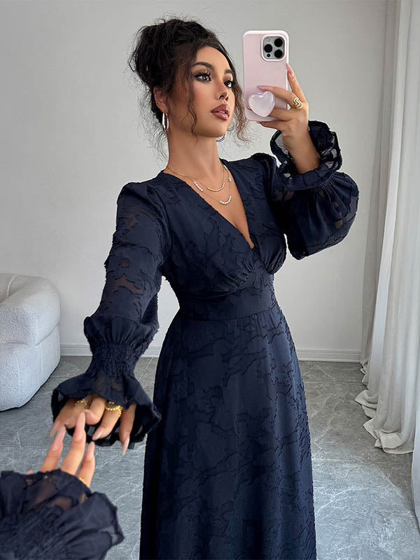 A-Line Elasticated Waist Jacquard Leaves Print Ruffled Solid Color Split-Joint Deep V-Neck Midi Dresses