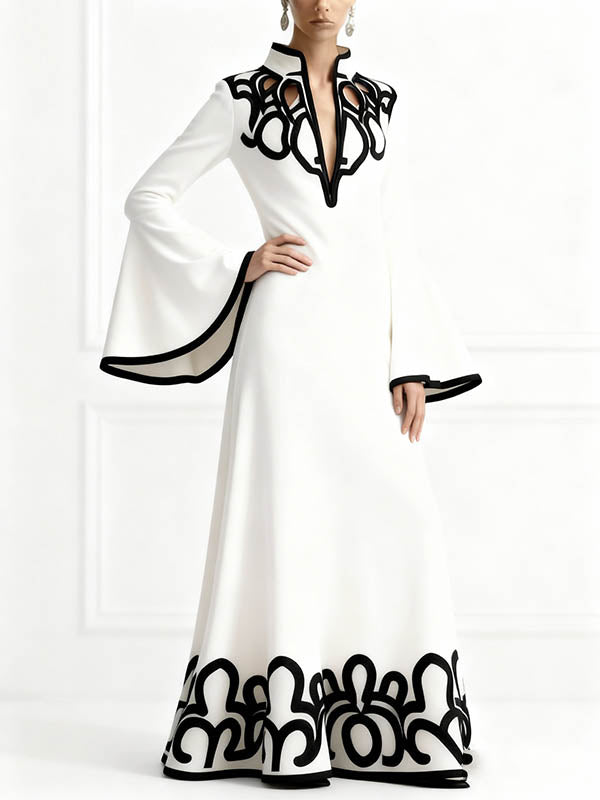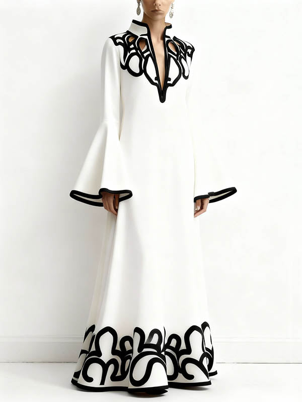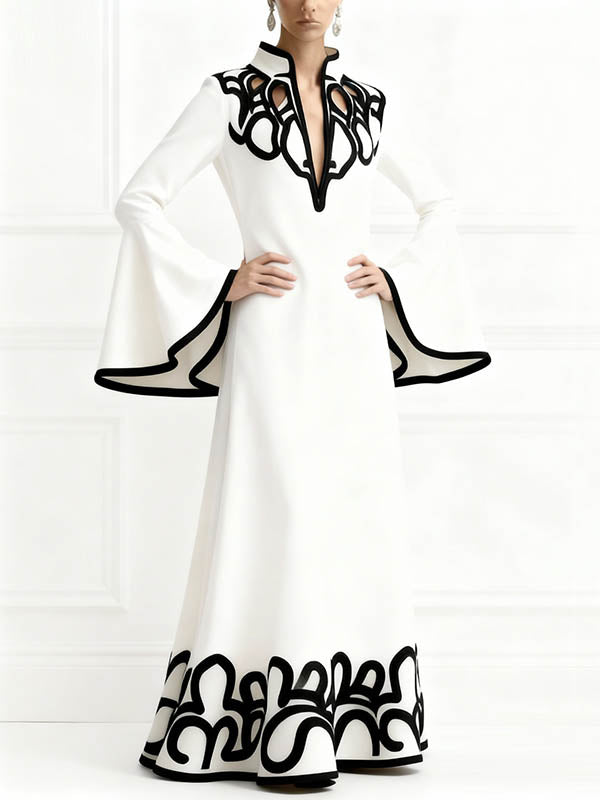 A-Line Flared Sleeves Abstract Printed Contrast Color Hollow Line Split-Joint Stand Collar Maxi Dresses