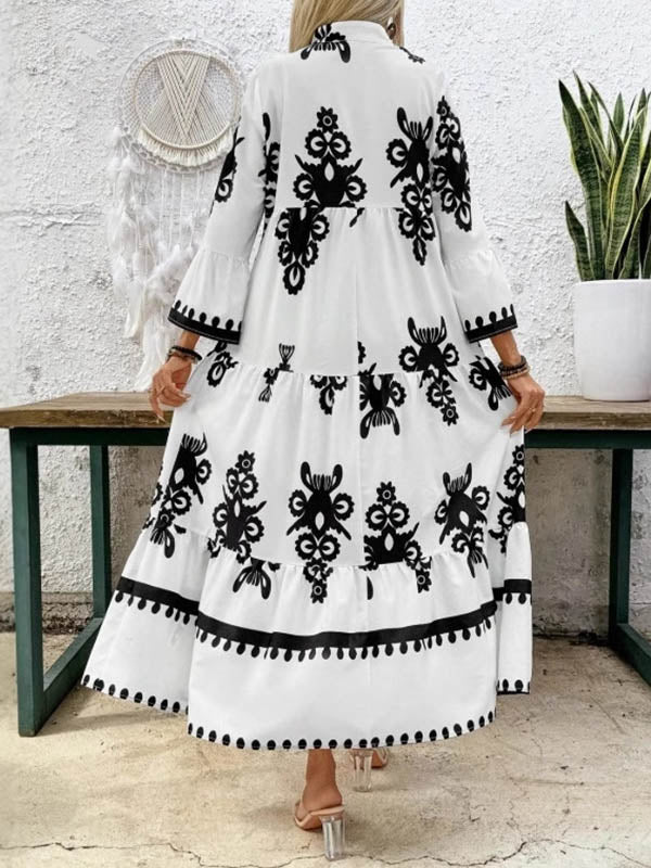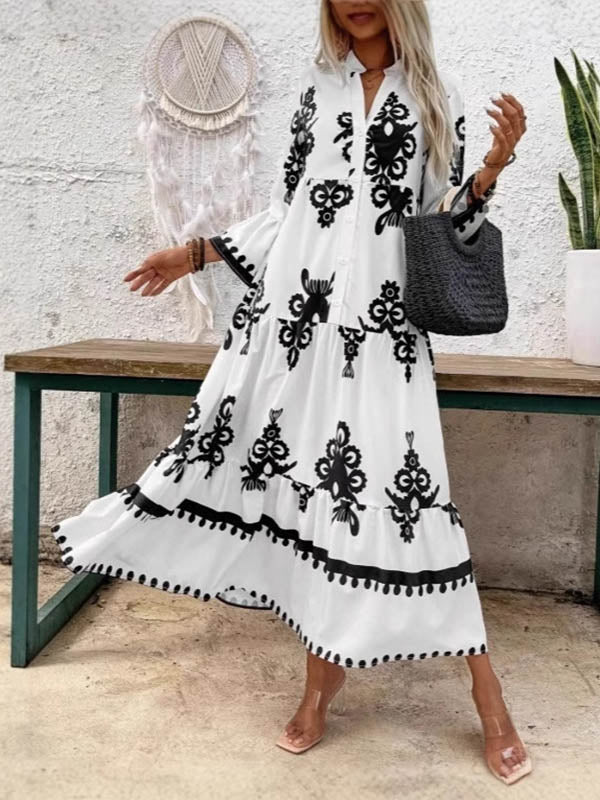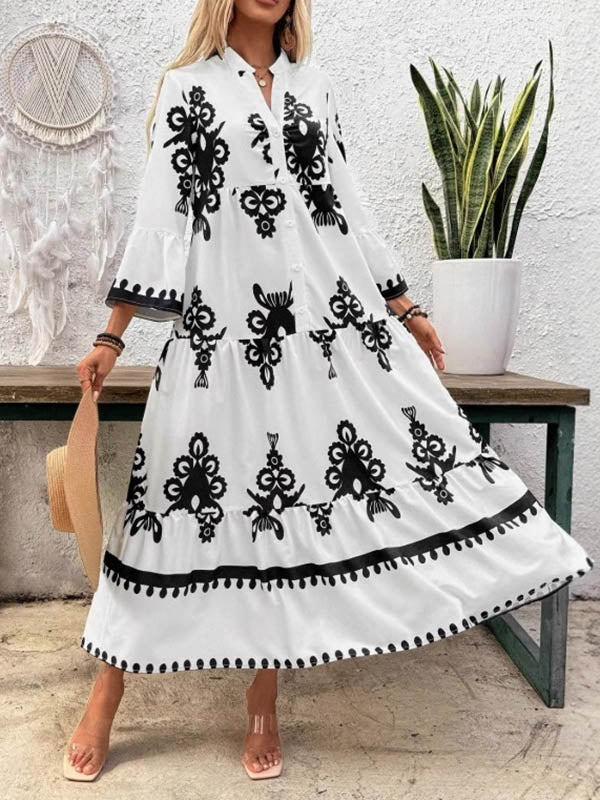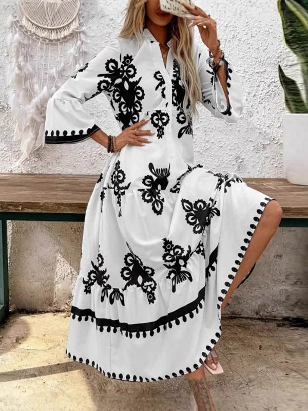 A-Line Flared Sleeves Buttoned Contrast Color Flower Print Split-Joint V-Neck Maxi Dresses Shirt Dress