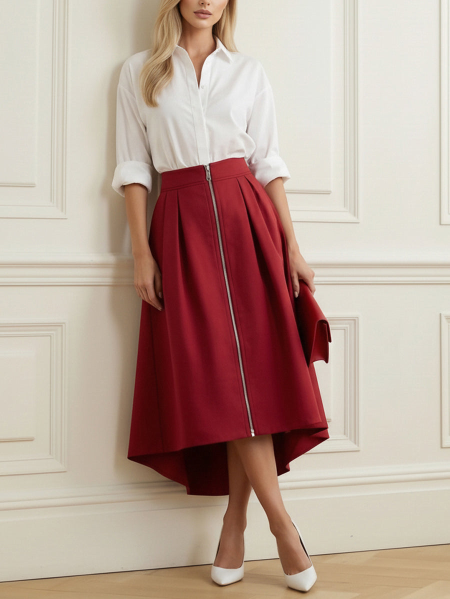 A-Line High-Low Pleated Pockets Solid Color Zipper Skirts Bottoms