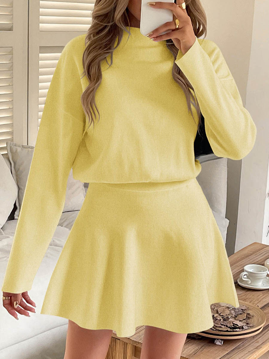 A-line High Waisted Elasticity Solid Color Round-neck Mini Dresses Sweater Dresses