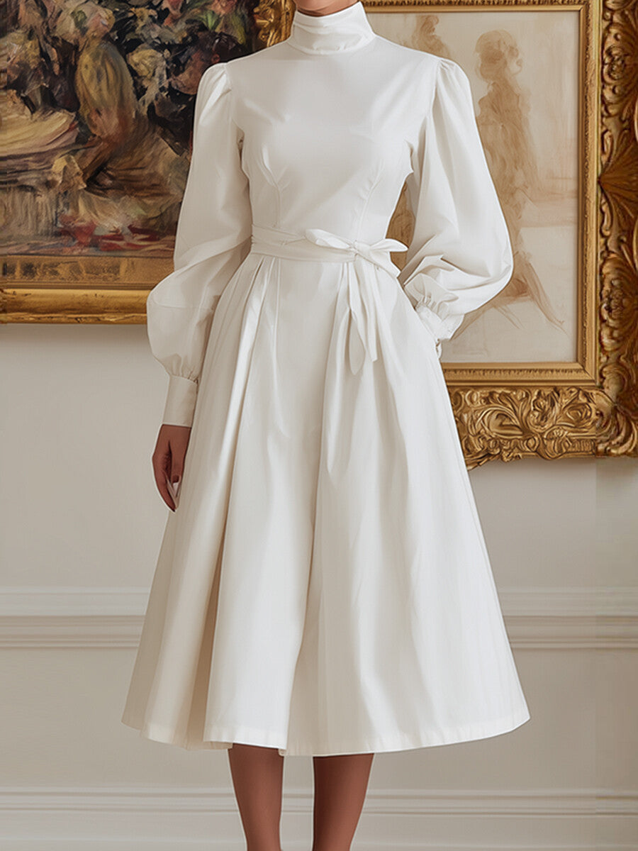 A-Line High Waisted Pleated Pockets Solid Color Tied Waist High Neck Midi Dresses
