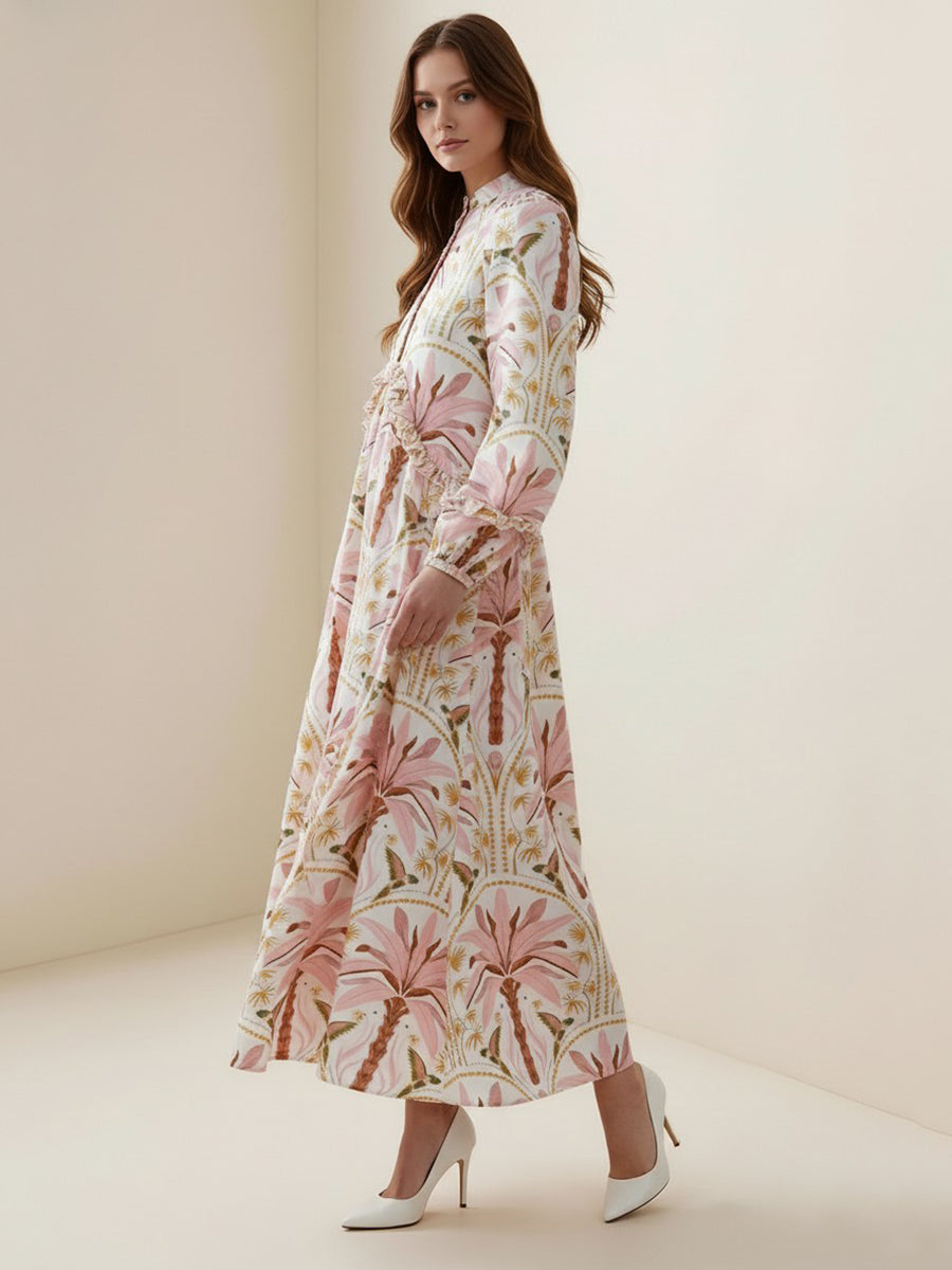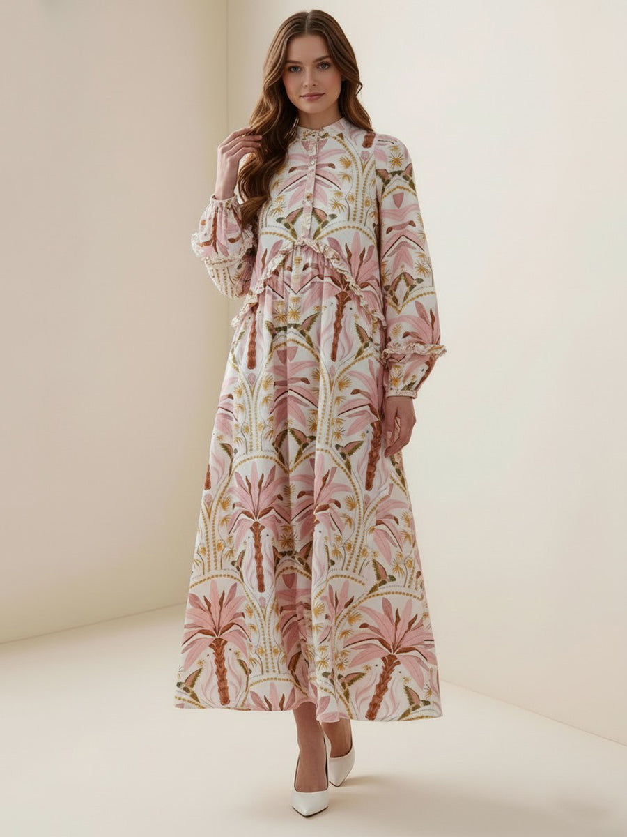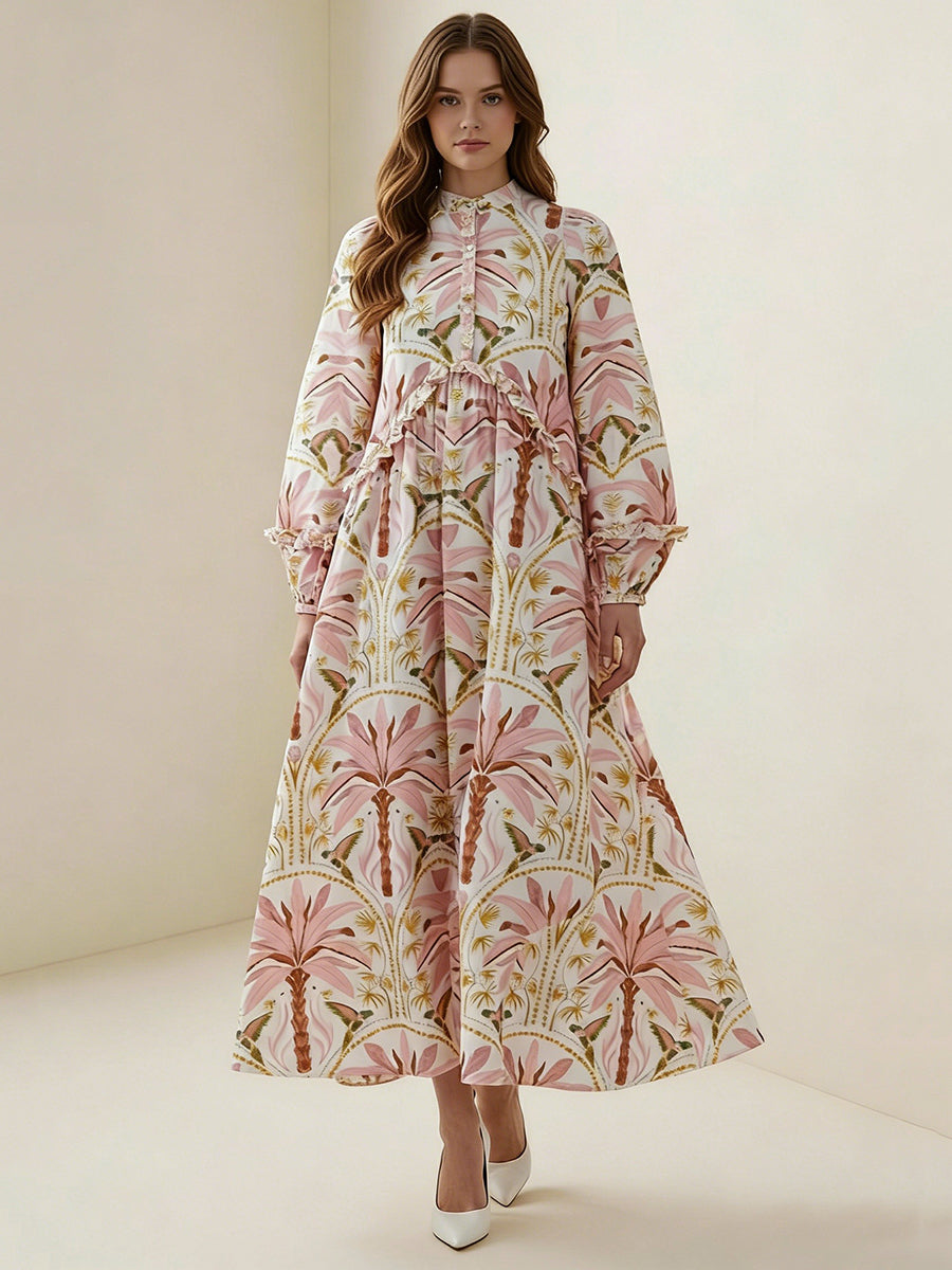 A-Line Long Sleeves Big Hemline Buttoned Contrast Color Flower Print Pleated Ruffled Split-Joint Round-Neck Maxi Dresses