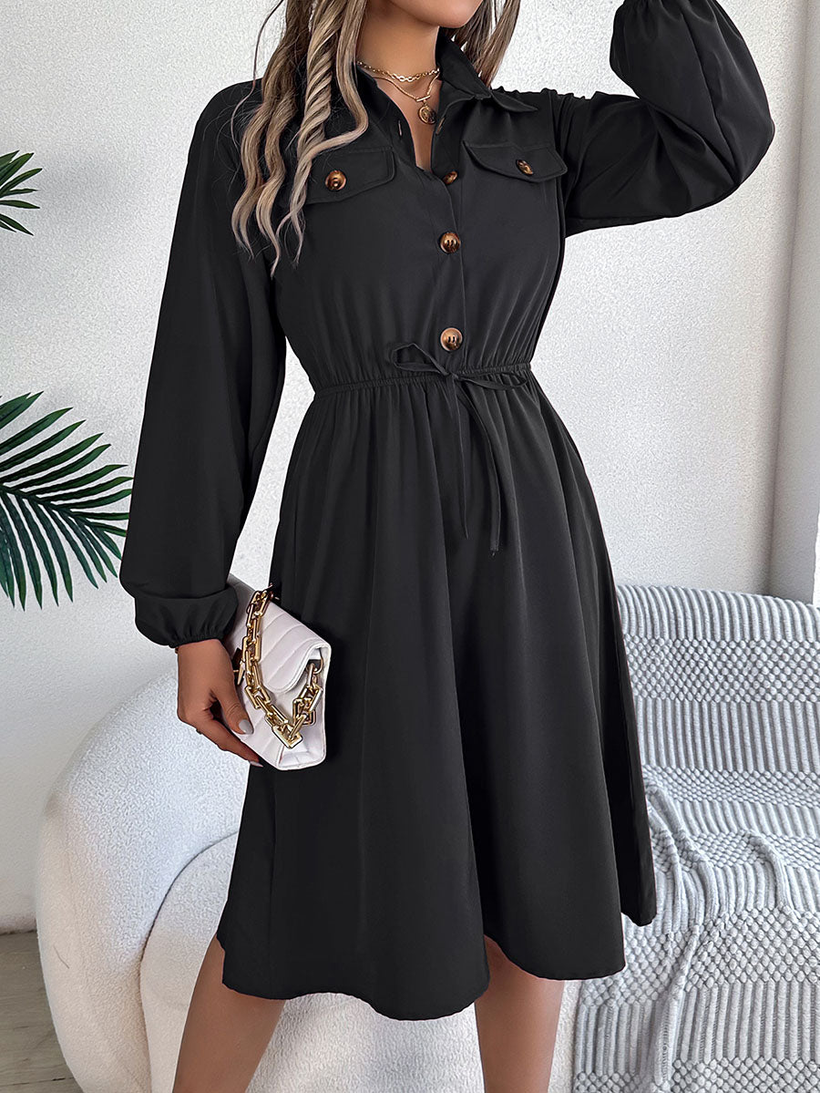 A-line Long Sleeves Buttoned Pleated Solid Color Tied Lapel Midi Dresses Shirt Dress
