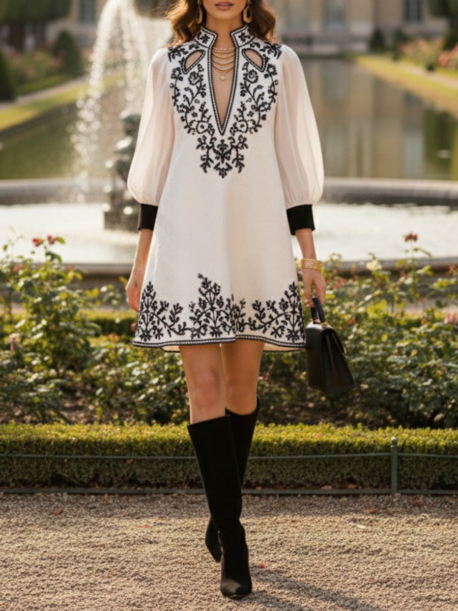 A-Line Long Sleeves Contrast Color Flower Print Hollow Split-Joint Stand Collar Mini Dresses