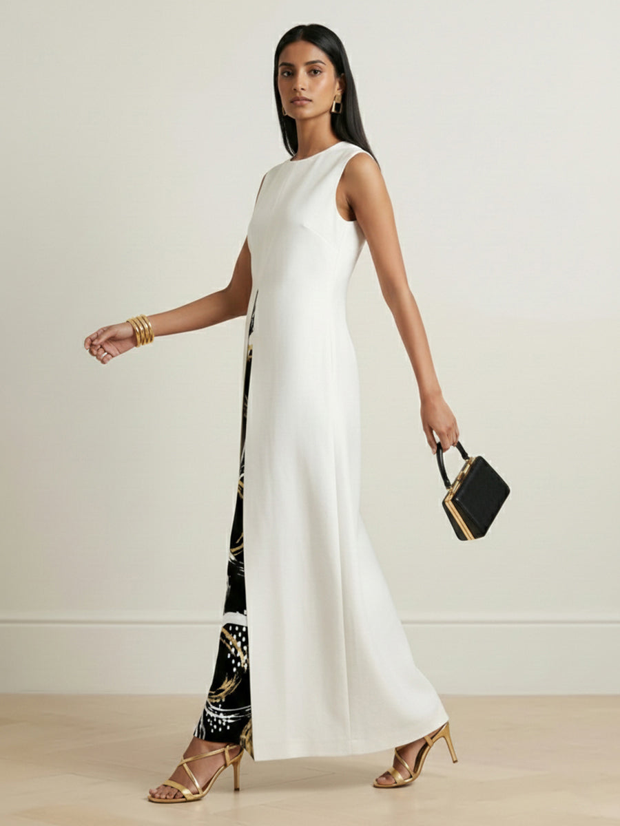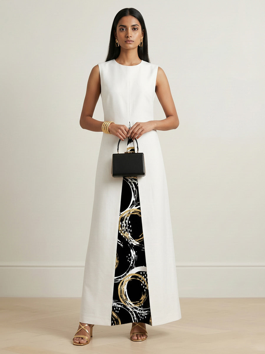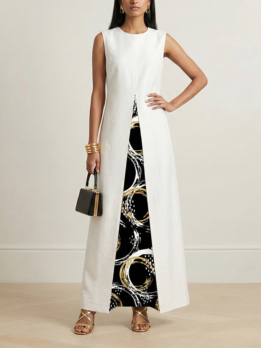 A-Line Long Sleeves Contrast Color Printed Split-Front Split-Joint Round-Neck Maxi Dresses