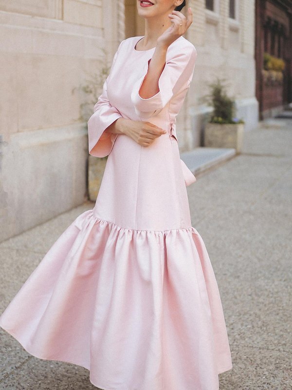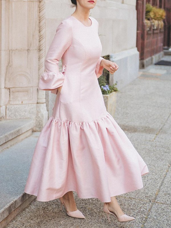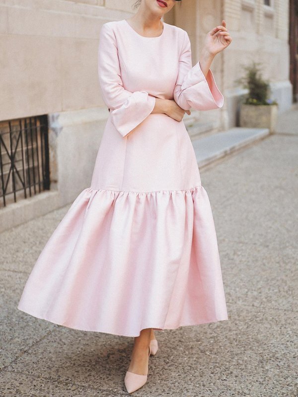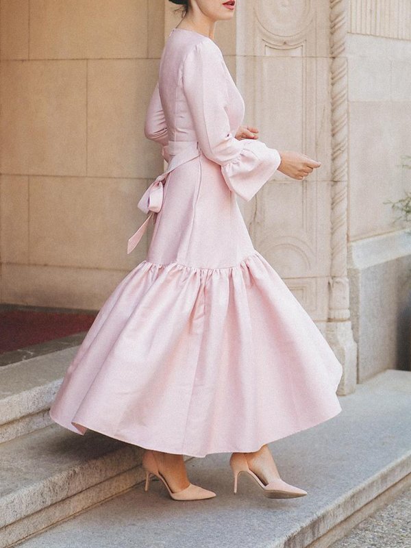 A-Line Long Sleeves Pleated Solid Color Split-Joint Tied Waist Round-Neck Maxi Dresses