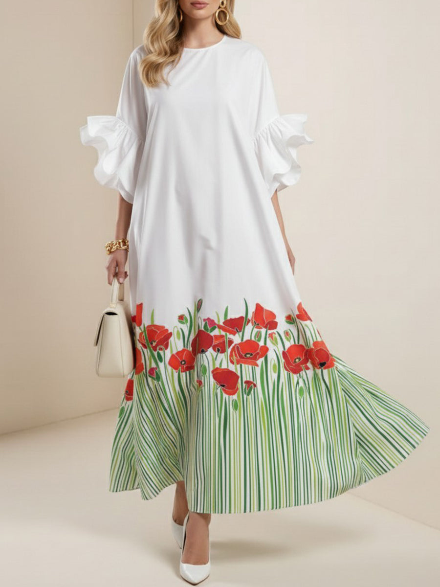 A-Line Loose Contrast Color Flower Print Split-Joint Striped Round-Neck Maxi Dresses
