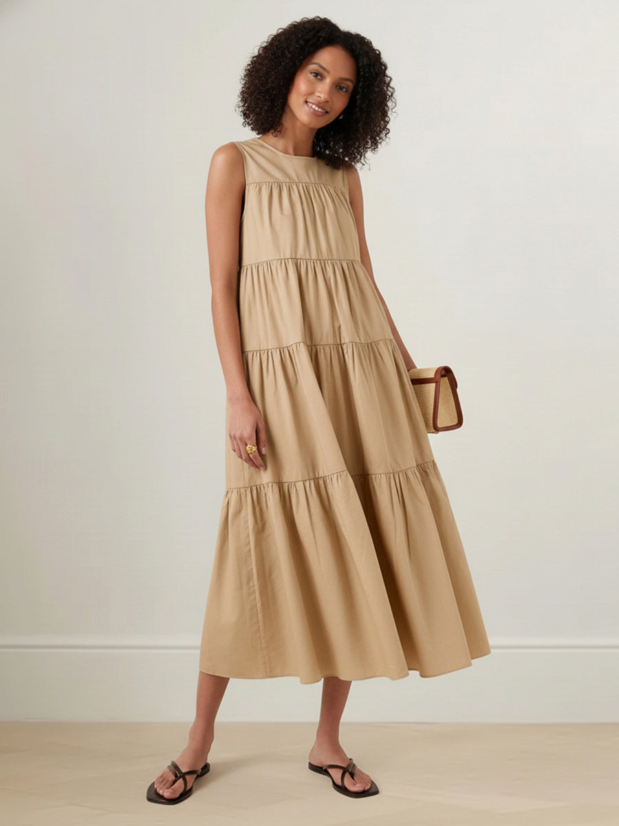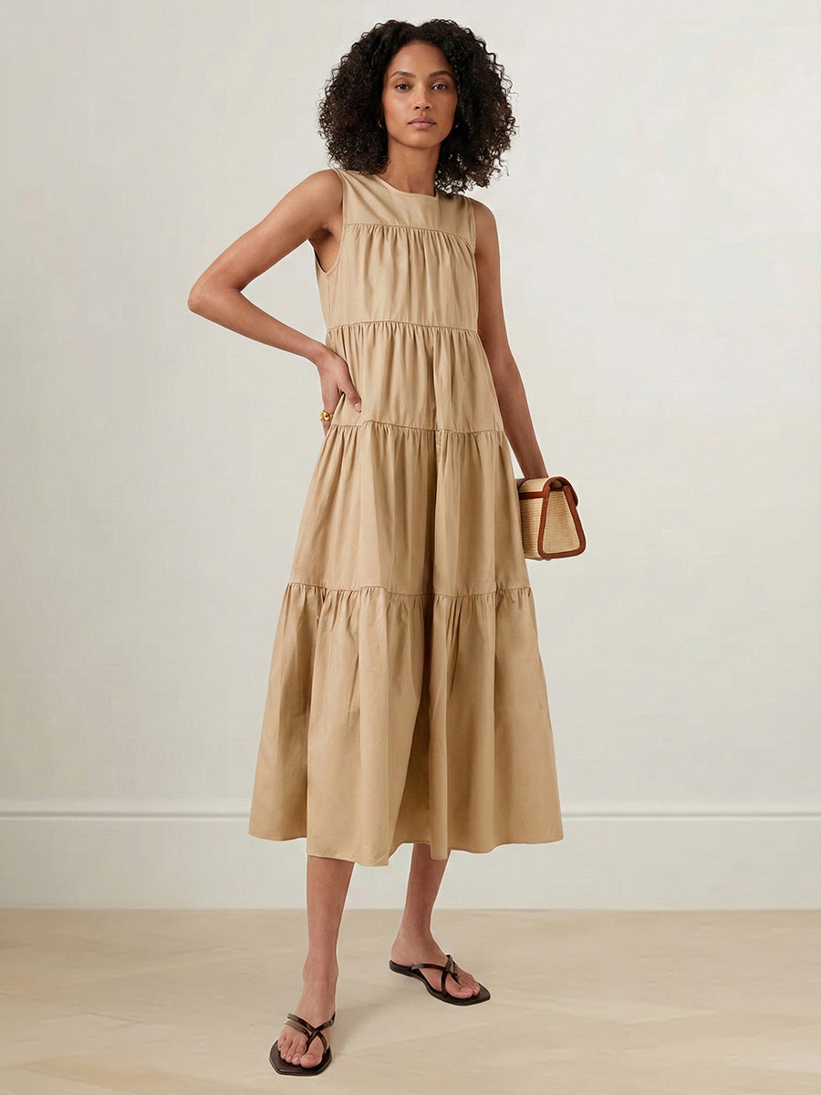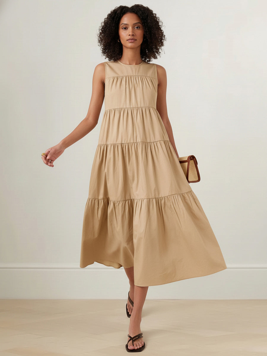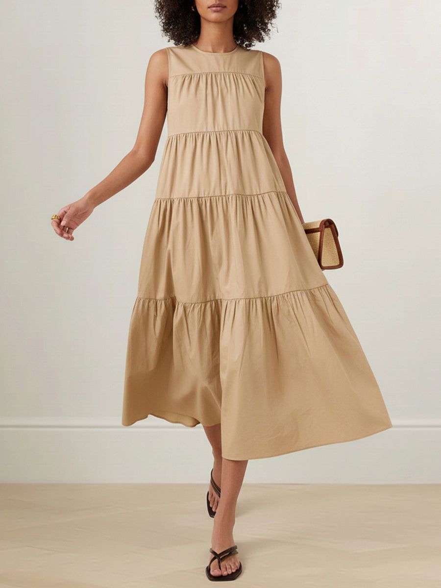 A-Line Loose Layered Pleated Solid Color Round-Neck Midi Dresses