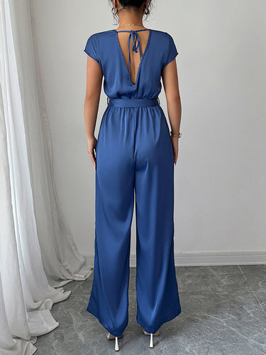 High Waisted Loose Backless Pleated Pockets Solid Color Tied Waist V-Neck Jumpsuits