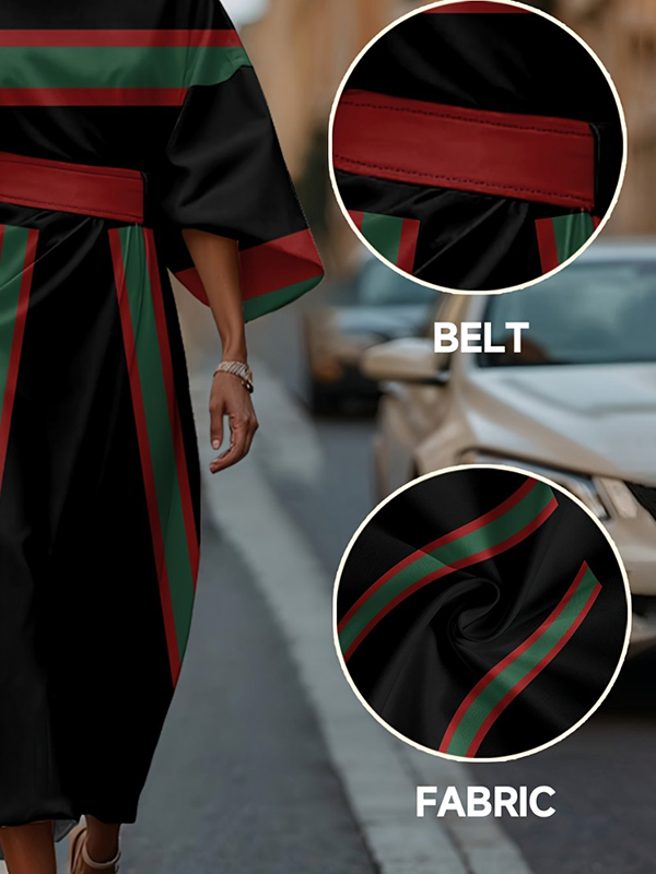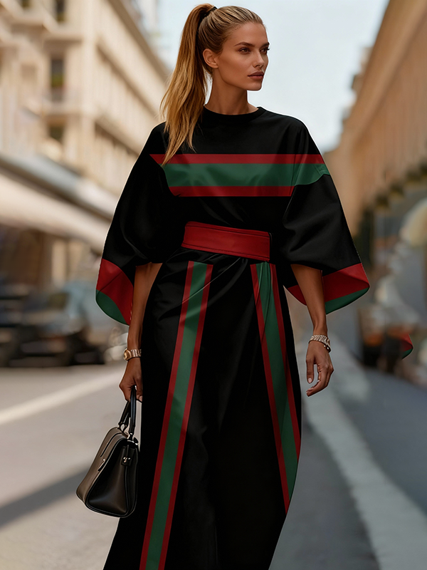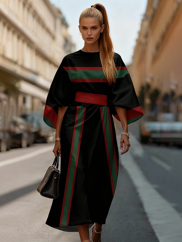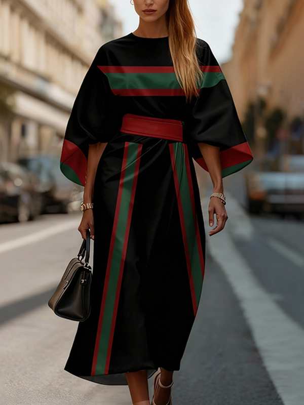 Batwing Sleeves Elasticated Waist Contrast Color Split-Joint Striped Round-Neck Midi Dresses