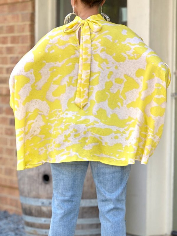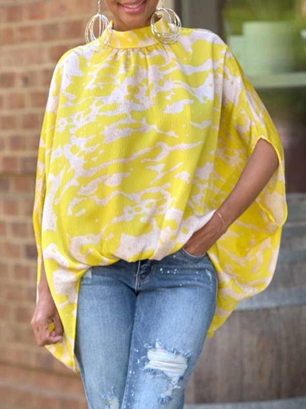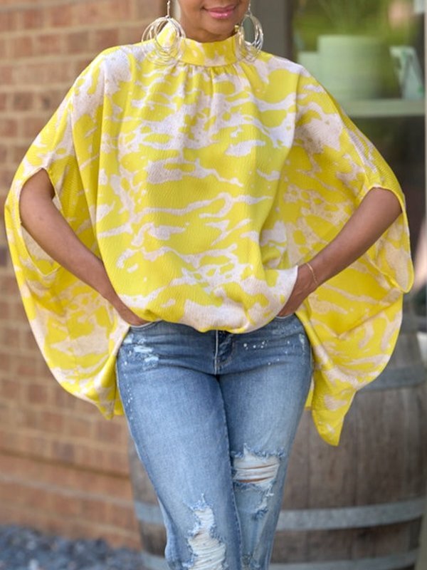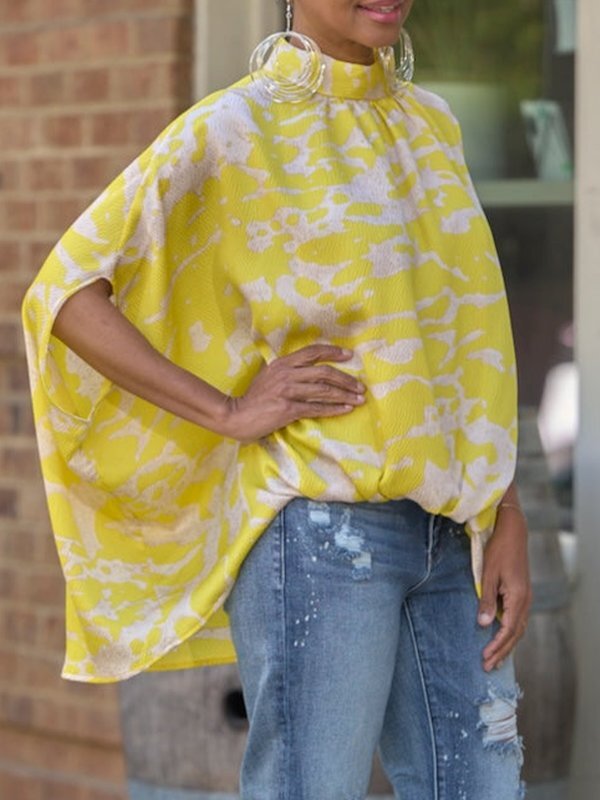 Batwing Sleeves Half Sleeves Flower Print Pleated Tied Mock Neck Blouses&Shirts Tops