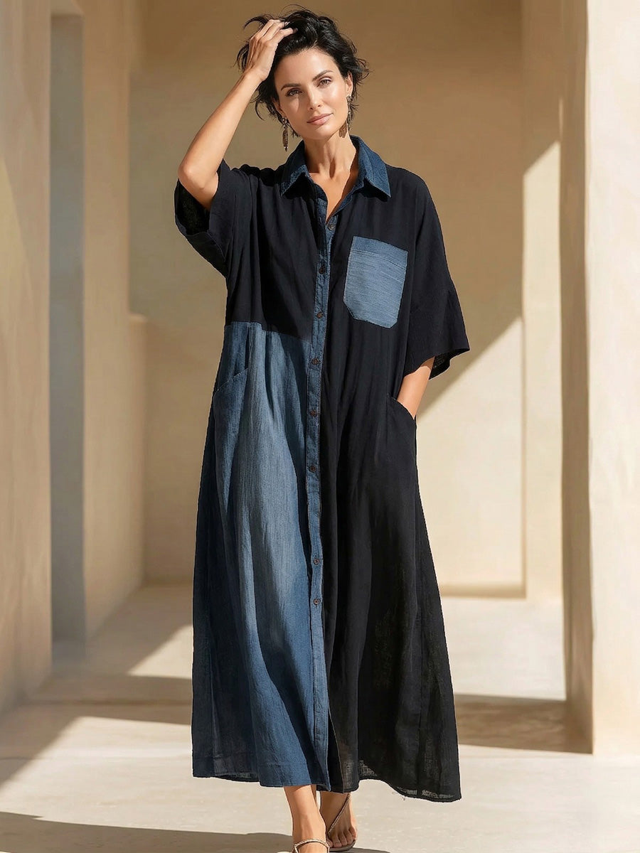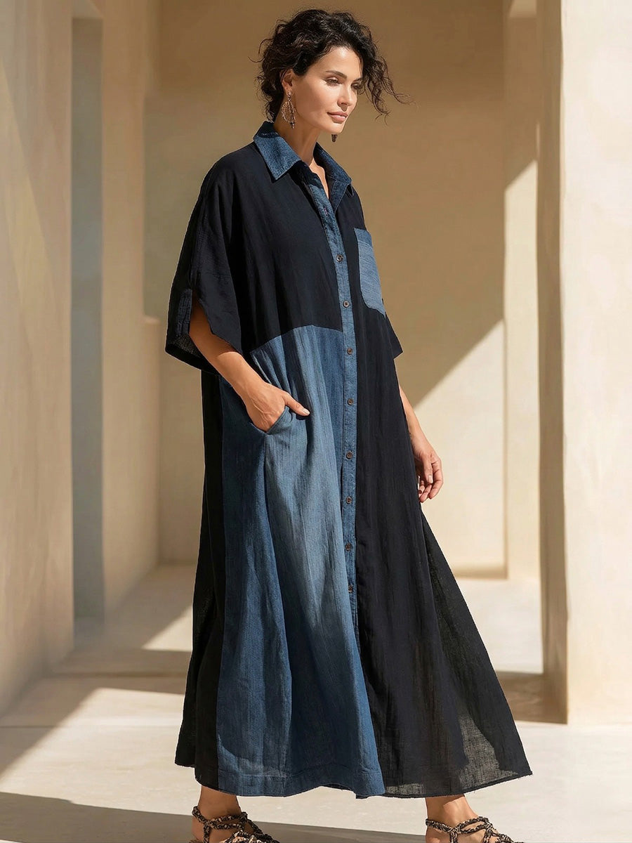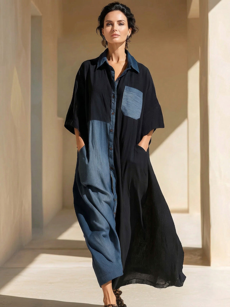 Batwing Sleeves Loose Buttoned Contrast Color Pockets Split-Joint Lapel Midi Dresses