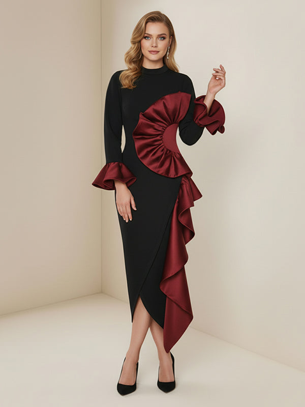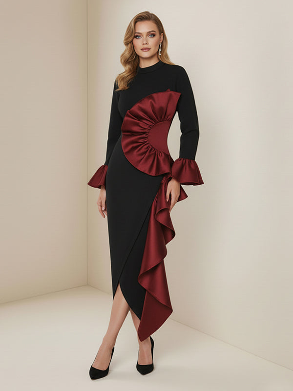 Bodycon Flared Sleeves Asymmetric Contrast Color Ruffled Zipper Stand Collar Midi Dresses