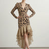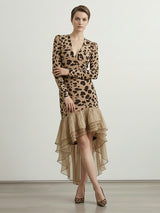 The inspiration for this leopard-print dress is "to wrap the wildness of the cheetah into the gentle waves of the skirt hem" - we stare blankly at the stripes of the grassland cheetah: there is a cold tension hidden in the brown spots, but why can't this "wildness" be mixed into romance? So the classic leopard print was pressed onto the body of the dress, and the layers of chiffon hem were made to look like "soft mist lifted by the wind". The V-neck revealed a bit of bone, and the high slit swayed with the steps, exuding a laid-back vibe.