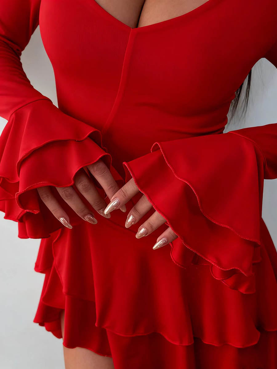 Bodycon High Waisted Asymmetric Pleated Ruffled Solid Color Split-Joint Deep V-Neck Mini Dresses