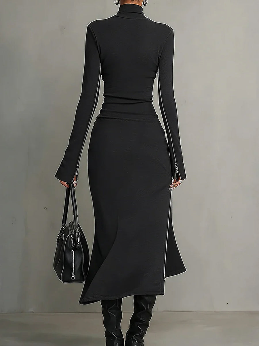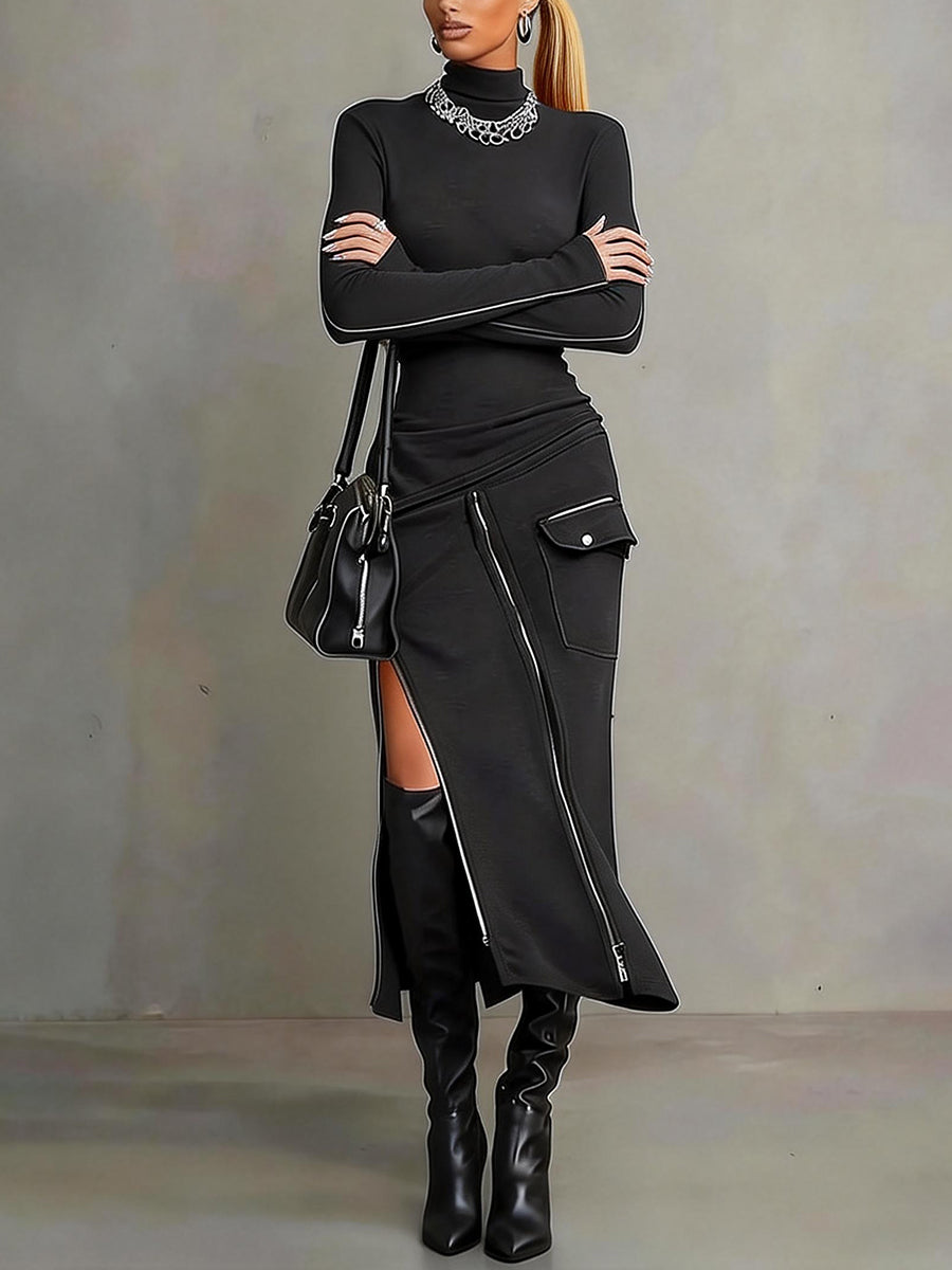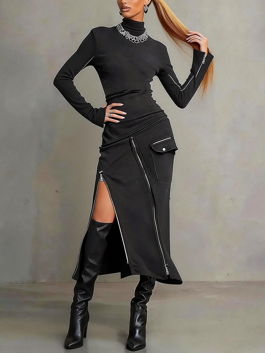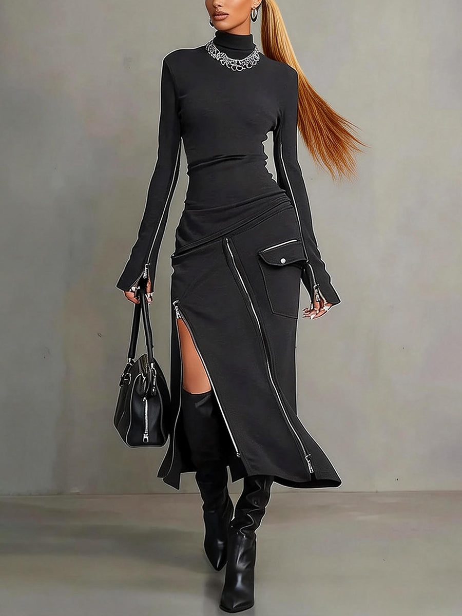 Bodycon Irregularity Asymmetric Pockets Solid Color Split-Joint Split-Side Zipper Half Turtleneck Midi Dresses