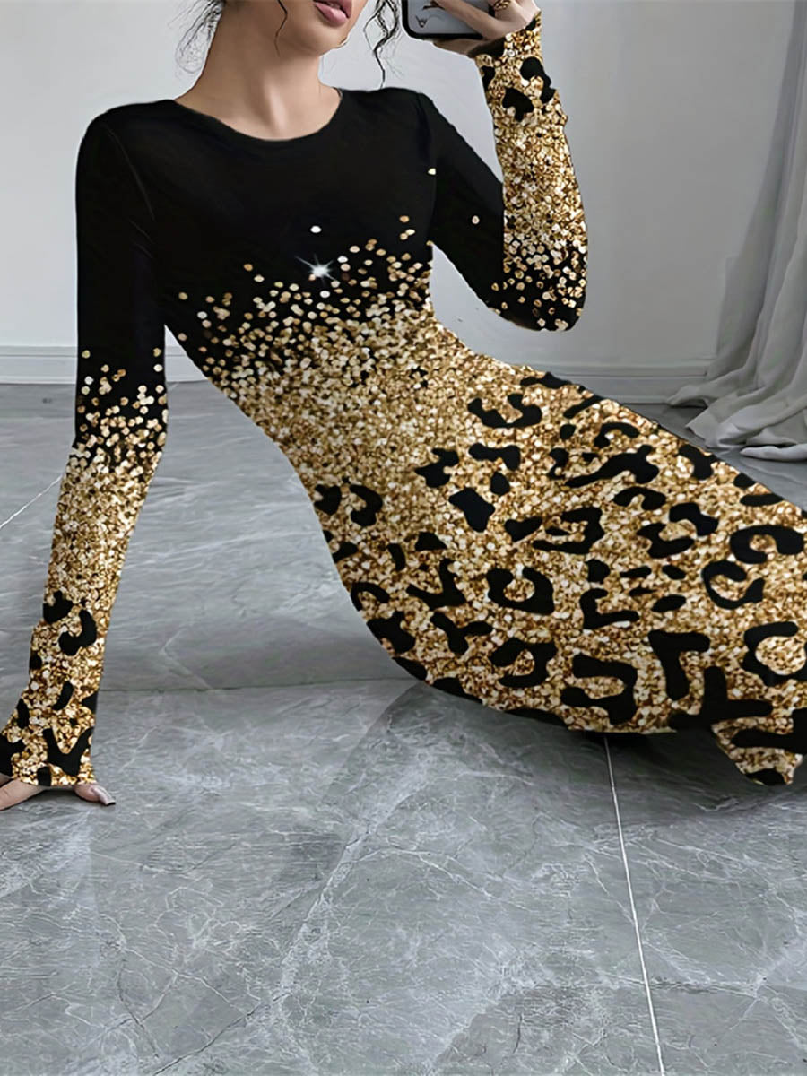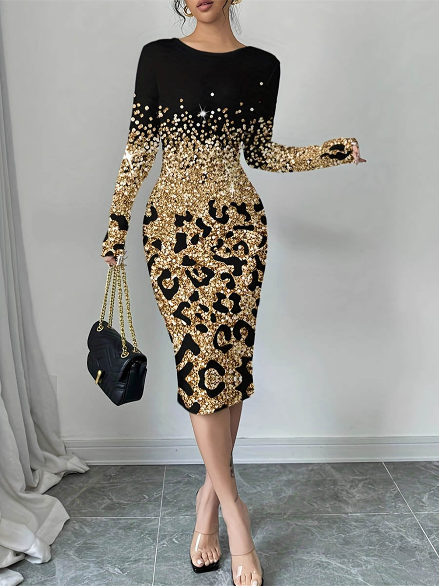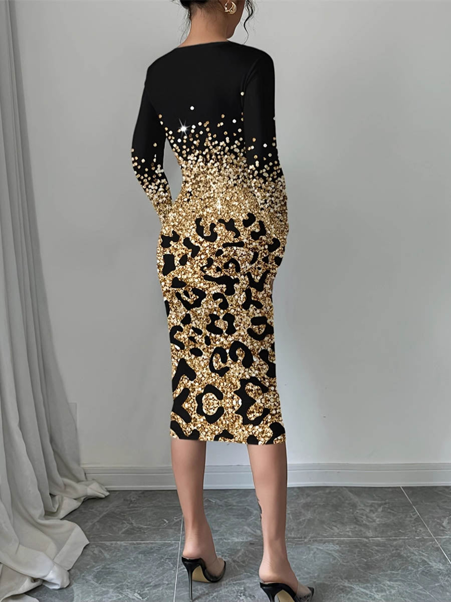 Bodycon Long Sleeves Contrast Color Leopard Shiny Split-Joint Round-Neck Midi Dresses