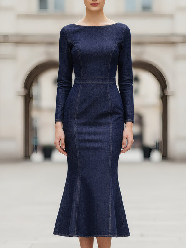 Bodycon Long Sleeves Solid Color Split-Joint Round-Neck Midi Dresses