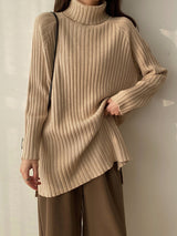 Casual Long Sleeves Loose Split-Side Solid Color High-Neck Sweater Tops
