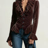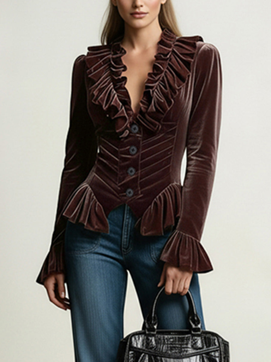 Elasticated Waist Flared Sleeves Buttoned Pleated Ruffled Solid Color Split-Joint Deep V-Neck Blouses&Shirts Tops