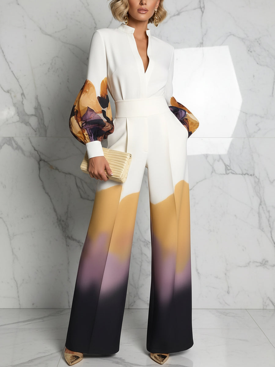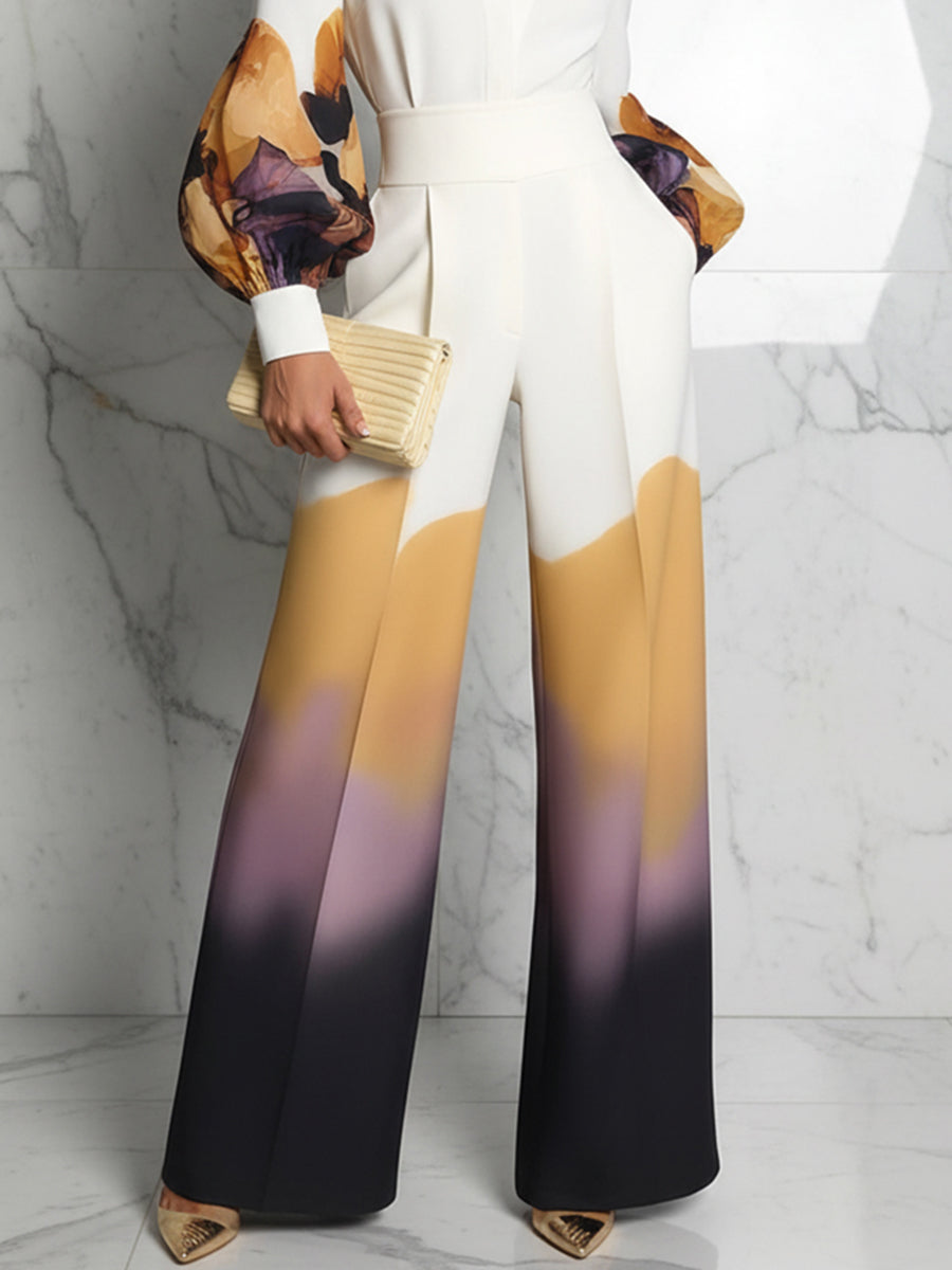Elasticated Waist High Waisted Abstract Printed Contrast Color Pockets Split-Joint Pants