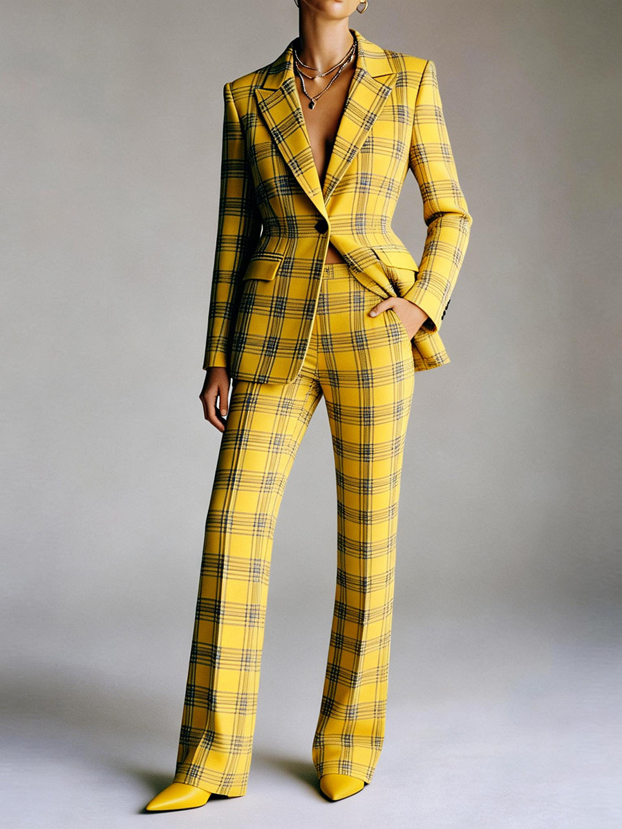 Elasticated Waist High Waisted Buttoned Contrast Color Plaid Split-Joint Notched Collar Blazer Outerwear