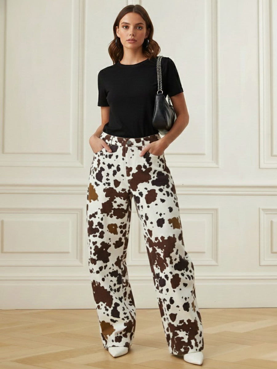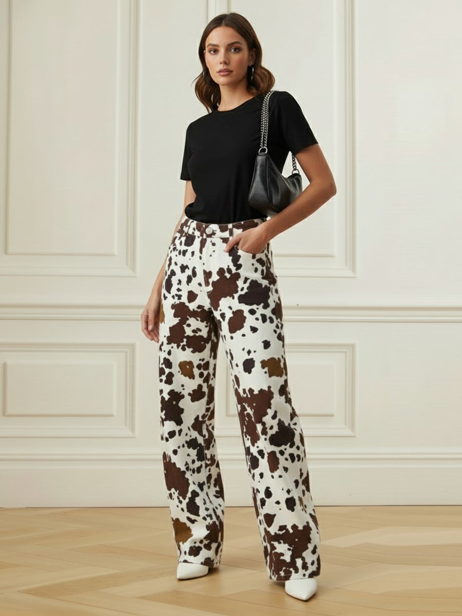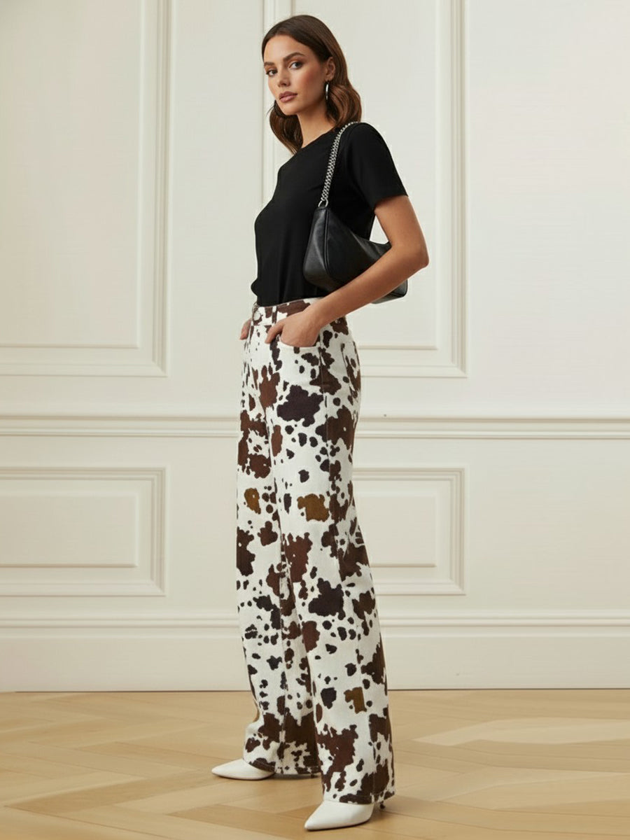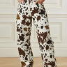 Elasticated Waist High Waisted Contrast Color Cow Printed Split-Joint Pants