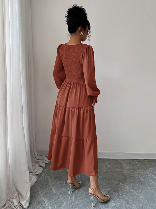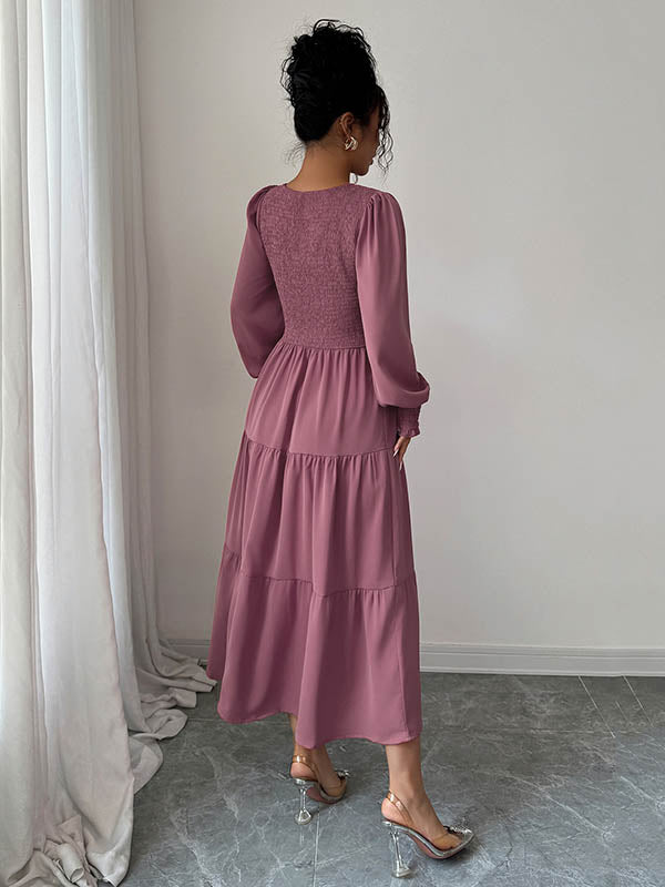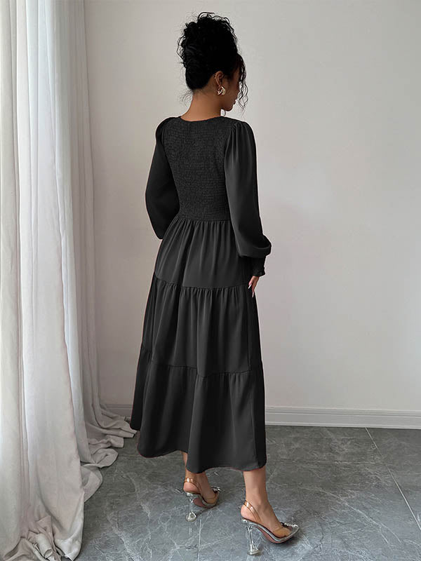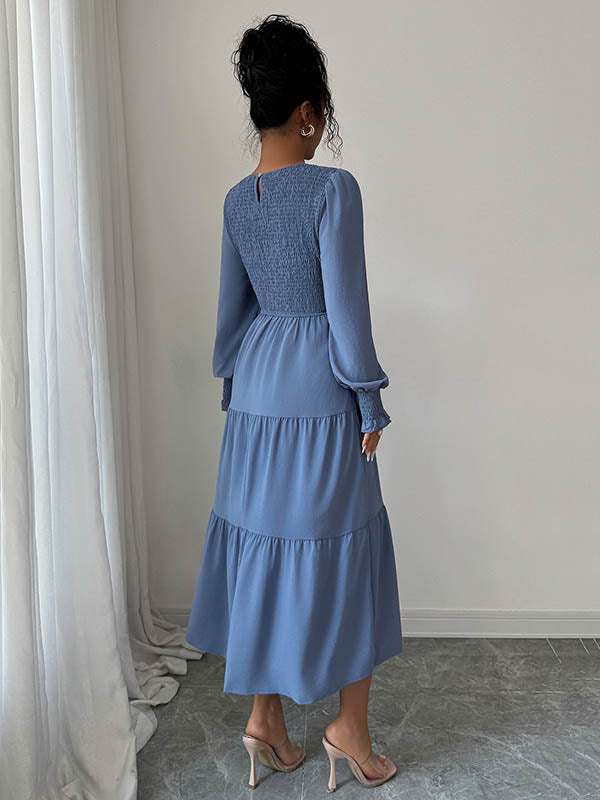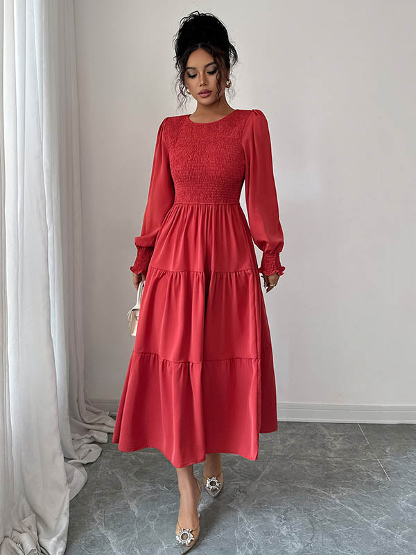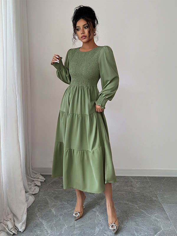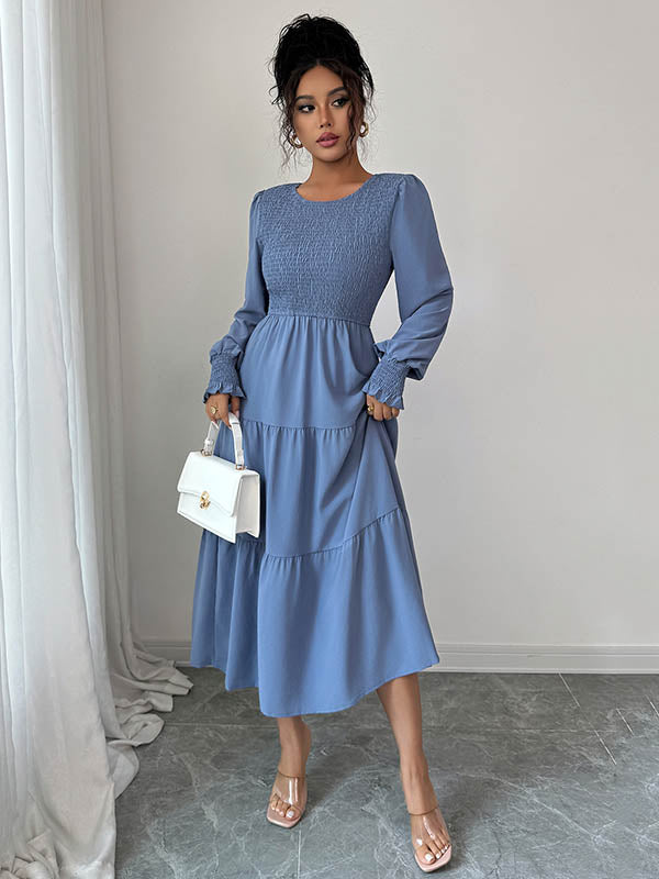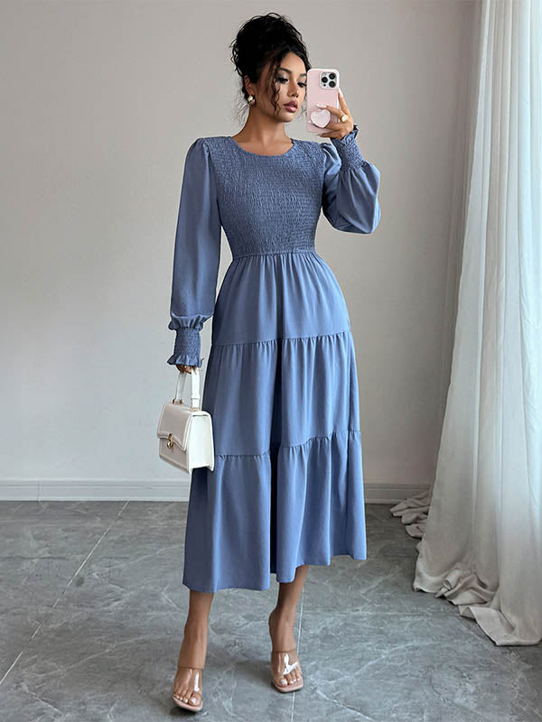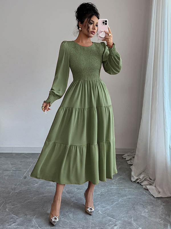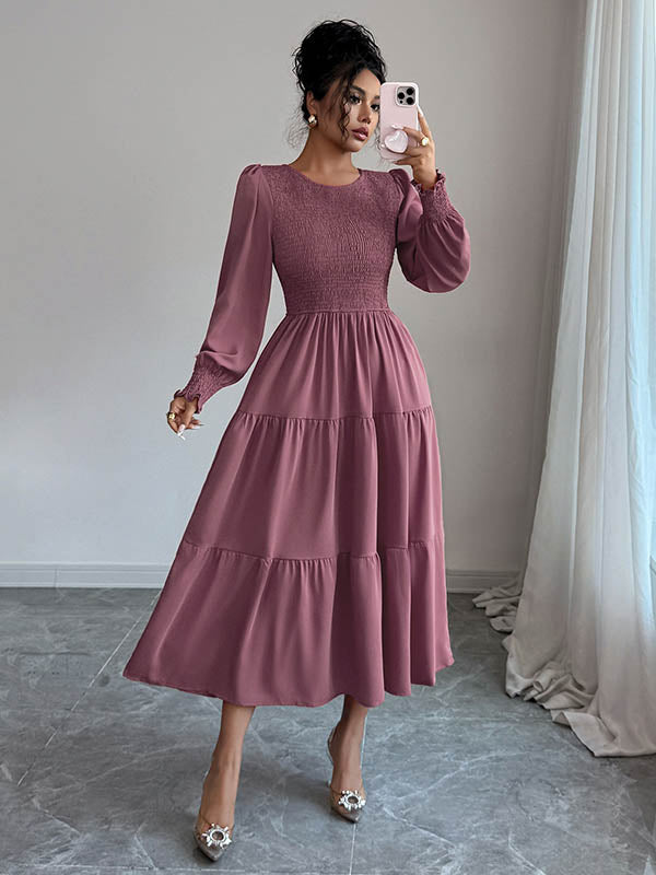 Elasticated Waist High Waisted Pleated Solid Color Split-Joint Round-Neck Midi Dresses