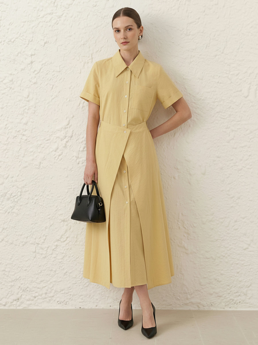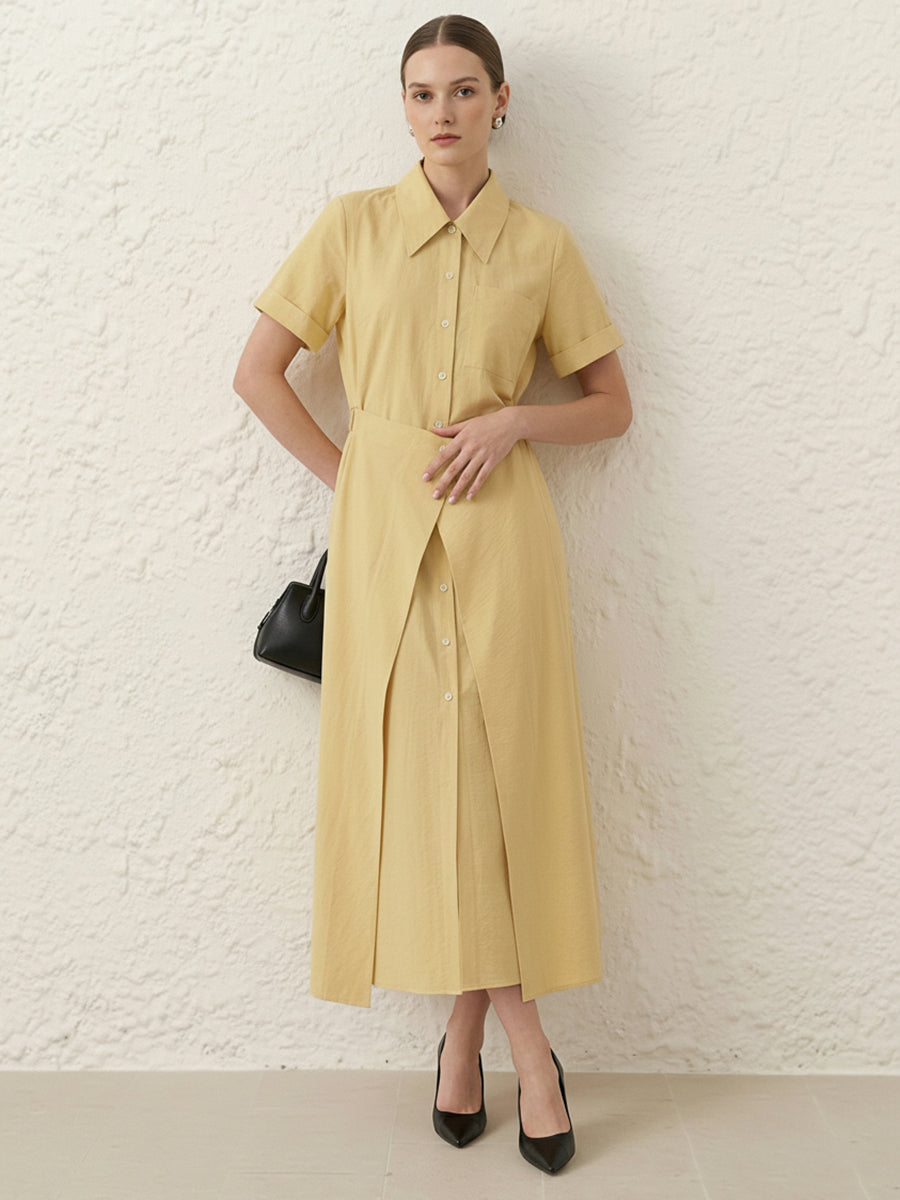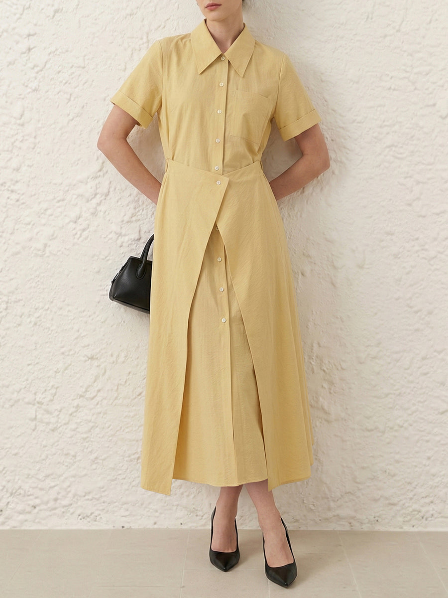 Elasticated Waist Short Sleeves Buttoned Layered Solid Color Split-Front Split-Joint Lapel Maxi Dresses Shirt Dress